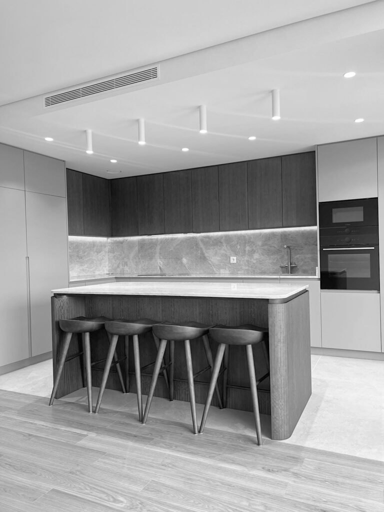 No projeto Arcela, a Capra desenvolve interiores exclusivos e totalmente personalizados, em colaboração com o Studio M15. O projeto abrange salas de estar e quartos, com mobiliário à medida — cozinha, móvel de TV, closet e cabeceiras de cama concebidos para unir estética, conforto e funcionalidade.