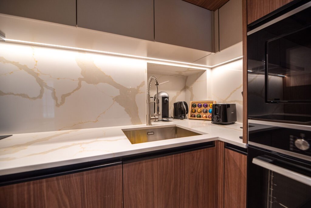 O projeto abrange dois quartos e duas casas de banho, além de áreas de estar meticulosamente organizadas. Entre os elementos concebidos destacam-se cozinhas, revestimentos em mármore, portas em nogueira, closets e cabeceiras de cama, assim como todo o mobiliário das casas de banho, pensados para aliar funcionalidade e estética com requinte absoluto.